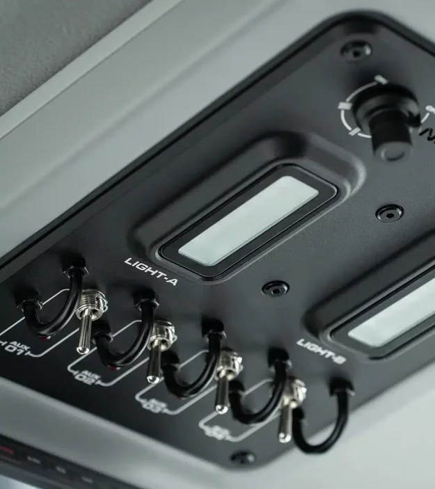 Tento systém integruje klíčové funkce, jako je bezpečný držák rádiového reproduktoru, snadno použitelné ovládací spínače a nastavitelné osvětlení přední a zadní řady, které zajistí optimální viditelnost v celém vašem vozidle.