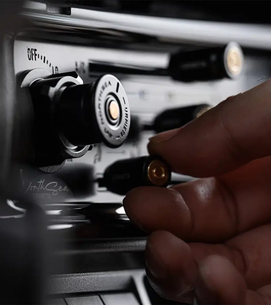 Každý volicí knoflík má design inspirovaný střelou, který odráží estetiku větracích otvorů a zároveň zvyšuje hmatový zážitek. Logo Northsea Signature Series, vyleptané do panelu, posiluje spojení s naším retro přístrojovým štítem a povznáší pocit řemeslného zpracování.
