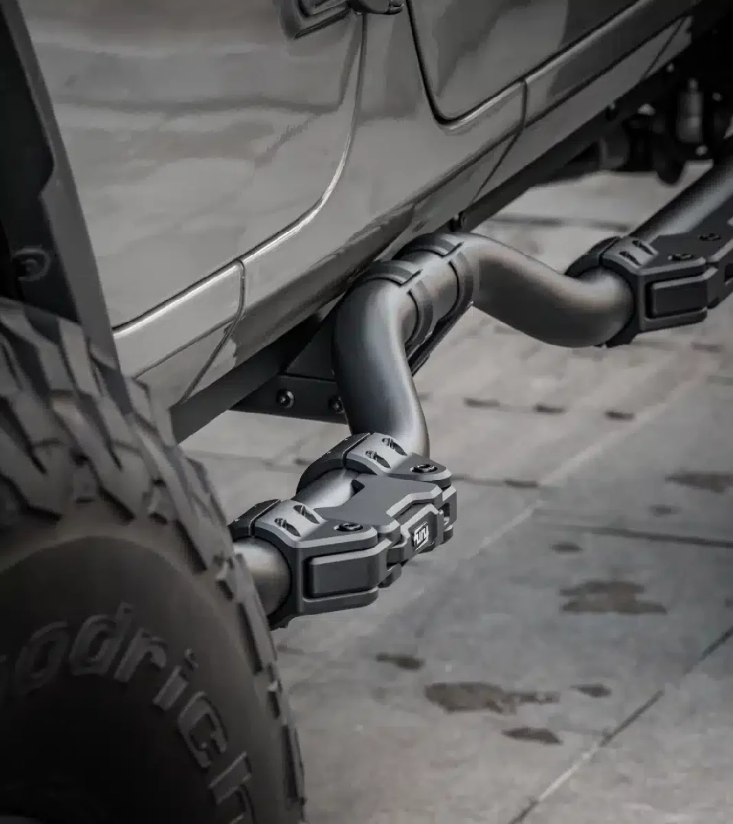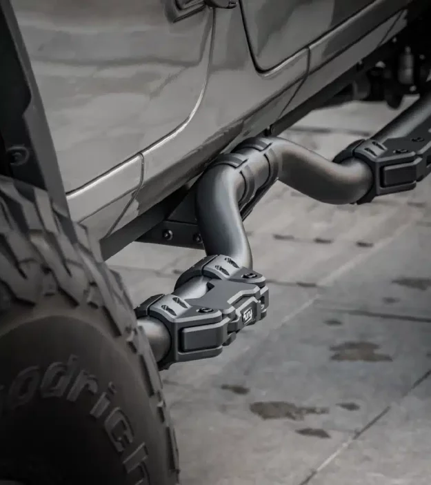 The side bars integrate decorative strips to conceal factory bodywork holes, offering a clean look without the need for rivets, resulting in smooth, seamless installation. With the right width for comfortable stepping, these side bars are perfectly aligned with the vehicle’s proportions, fitting harmoniously with the front and rear fender flares.