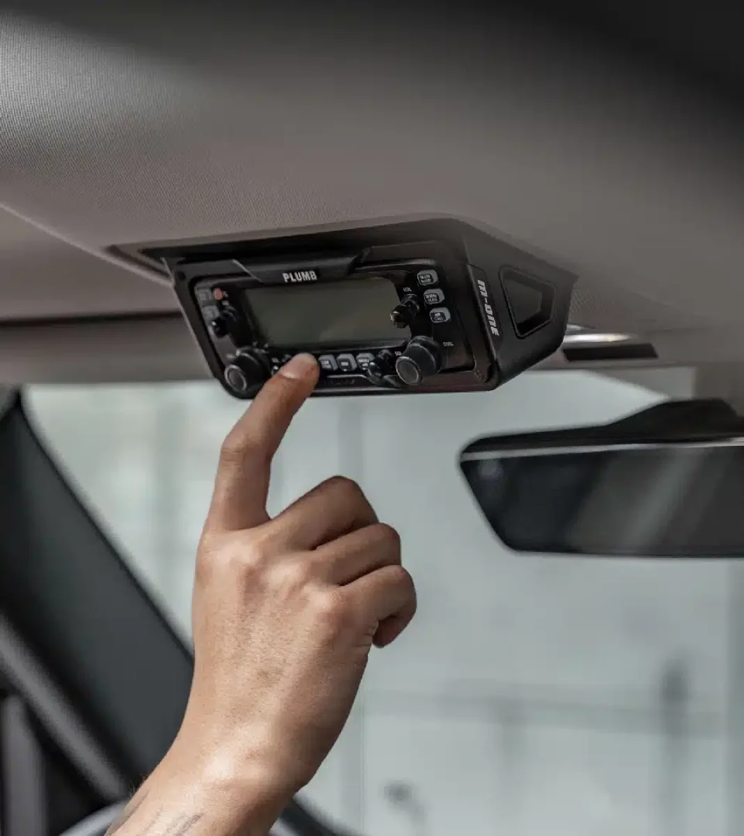 The PLUMB Set-Top Box relocates the car radio to a more convenient position, replacing the overhead glasses case for easy access during off-road adventures. This repositioning optimizes the interior layout, enhancing functionality without sacrificing space. Designed for compatibility with FTM-6000R and ICOM2730 radios, this setup ensures seamless integration and convenience for off-road communication needs.